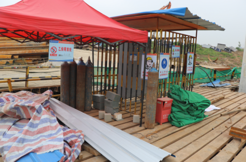 D、钢筋堆放未覆盖防雨布