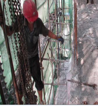 图中关于附着式升降脚手架附着隐患描述正确的是。 ( )