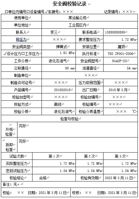 下图为某安全阀校验站校验罐车上安全阀的记录,记录中哪些项目填写错误()?