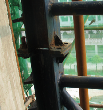 图中关于附着式升降脚手架附着隐患描述正确的是。 ( )