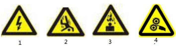 A、1-当心触电;2-当心滑跌;3-当心落物;4-当心机械伤人