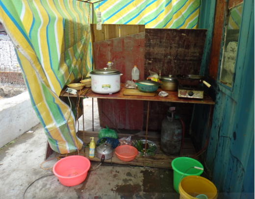 D、民工使用雨布、模板搭设临时厨房