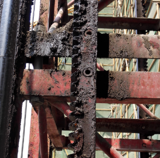 下图为导轨架上齿条的隐患照片,在施工升降机安装好之后应对齿轮齿条进行检查,关于齿轮齿条检查下列叙述不正确的是()。