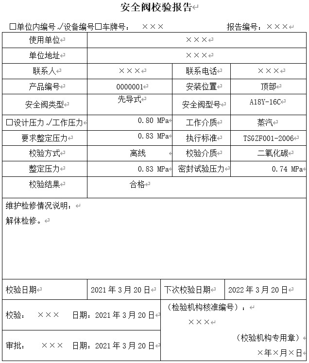 下图为某安全阀校验站校验蒸汽锅炉上安全阀的报告,报告中哪些项目填写错误()?