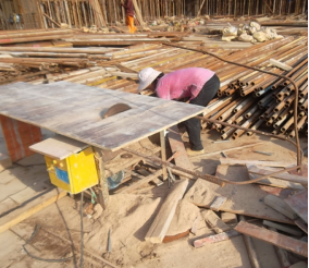 D、锯沫渣、模板、木方等易燃材料乱堆乱放,未及时清理归堆,堵塞通道