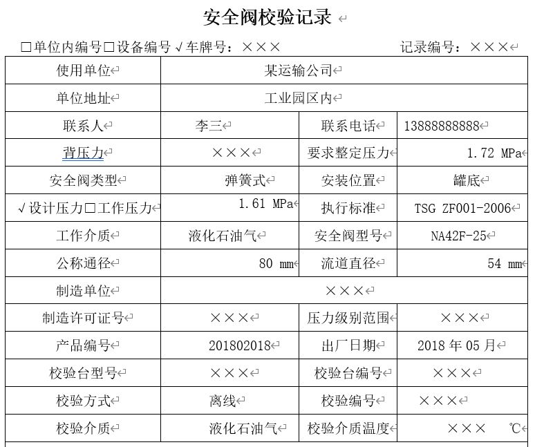 下图为某安全阀校验站校验罐车上安全阀记录的一部分,记录中哪些项目填写错误()?