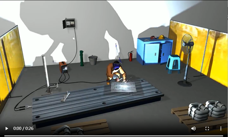 您刚才看到的动画中存在下列何种安全隐患:(场景描述:焊接车间作业现场,一名焊工正在进行焊接操作。身体局部皮肤直接 接触工件或焊机。)