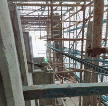 如图某项目使用的钢管式附着式升降脚手架,存在的隐患是( )