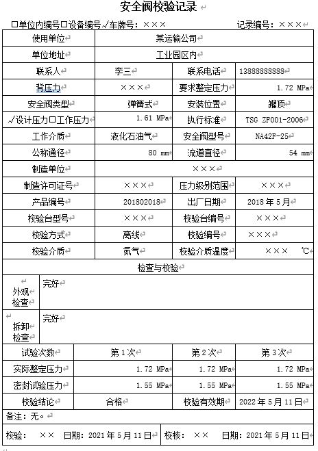 下图为某安全阀校验站校验罐车上安全阀的记录,记录中哪个项目填写错误()?
