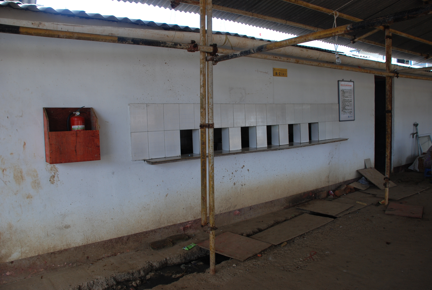 D、排水沟未清理沟盖板未盖严实、打饭窗口未做纱窗、厨房门未做纱门,厨房外雨阳棚立柱未做油漆 。